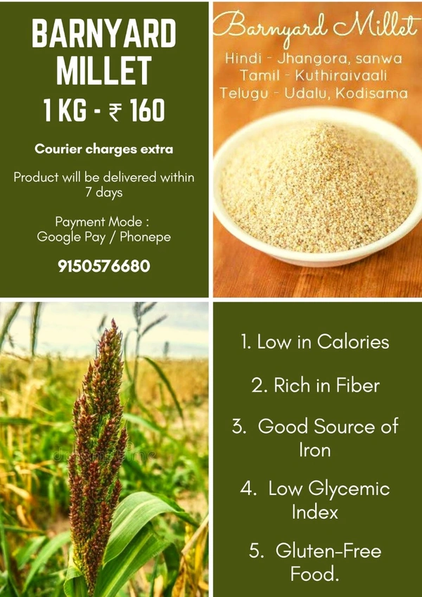 A serving of barnyard millets (25g, raw) gives 75 calories and 1.5g of protein. It is an excellent source of dietary fiber with a good amount of both soluble and insoluble fractions. The grain encompasses the highest amount of fiber in comparison to other grains and millets with a serve providing 2.4 grams of fiber.