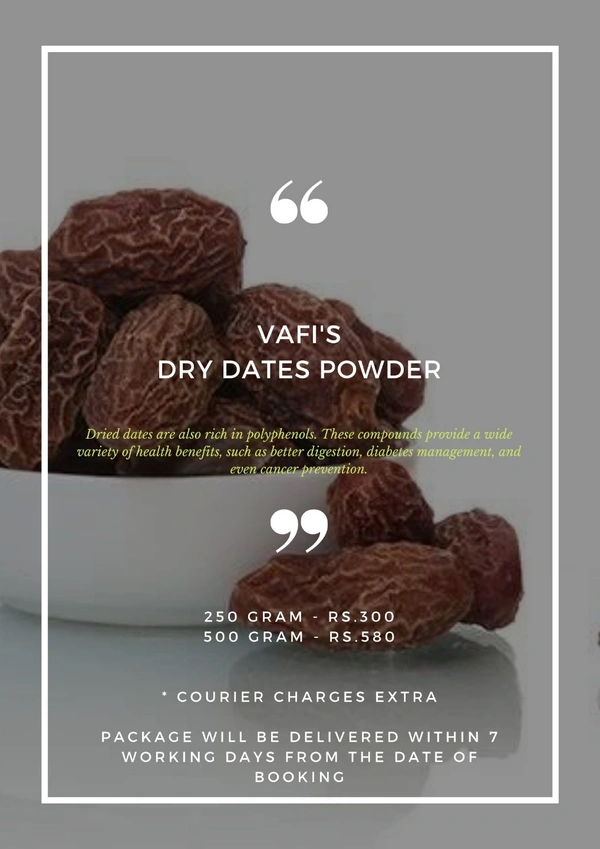 Nutritional Benefits: Being a good source of fibre dry dates powder is an excellent natural laxative that can ease constipation. Dry dates being rich in iron aid in fighting anaemia, while calcium, magnesium, vitamin A helps in boosting immunity.