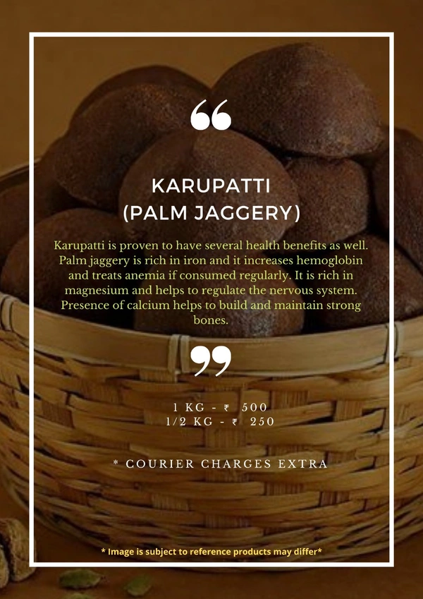 Karupatti is proven to have several health benefits as well. Palm jaggery is rich in iron and it increases hemoglobin and treats anemia if consumed regularly. It is rich in magnesium and helps to regulate the nervous system. Presence of calcium helps to build and maintain strong bones.
