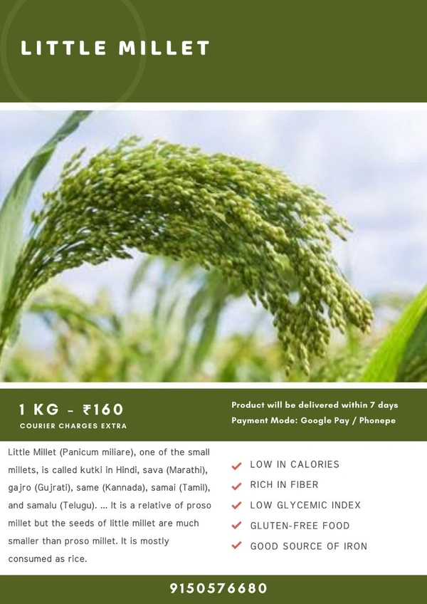 Little millet contains magnesium which can helps improve heart health. Vitamin B3 (niacin) in little millet helps lower cholesterol. Little millet is also a good source of phosphorus which, helps with fat metabolism, body tissue repair and energy production.